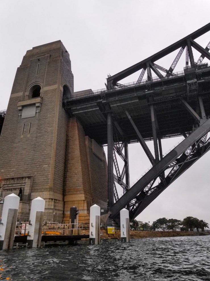 I hadn’t been in a kayak in probably two years, but I felt stable and at ease. Sydney by Kayak had really thought of everything. The life vests we were using had a convenient pocket in the front where I could put my phone, and we were also each given a small towel to store in there that we could use to wipe our hands. I had my camera in a dry bag that I set under my knees, and there was even a cup holder for my coffee. And my choice in clothing turned out to be just fine; it was about 18C (around 64F), and the harbour water was warm, almost bath temperature. I’m a messy paddler and always get a bit wet, and the drizzle added to that, but I didn’t mind it one bit.